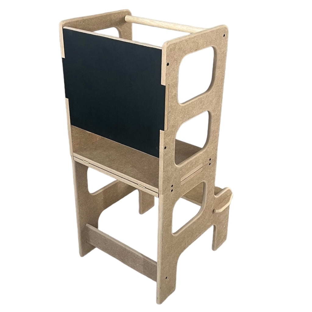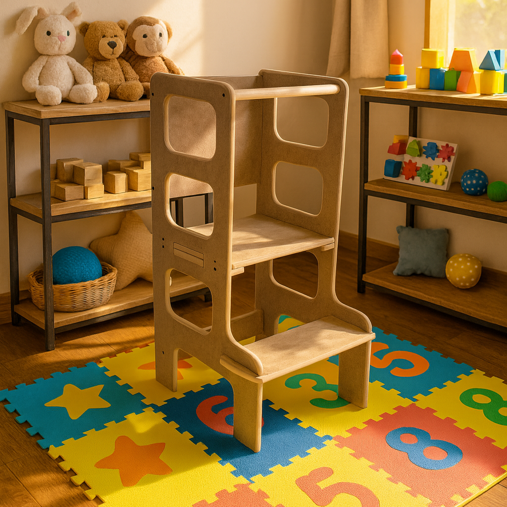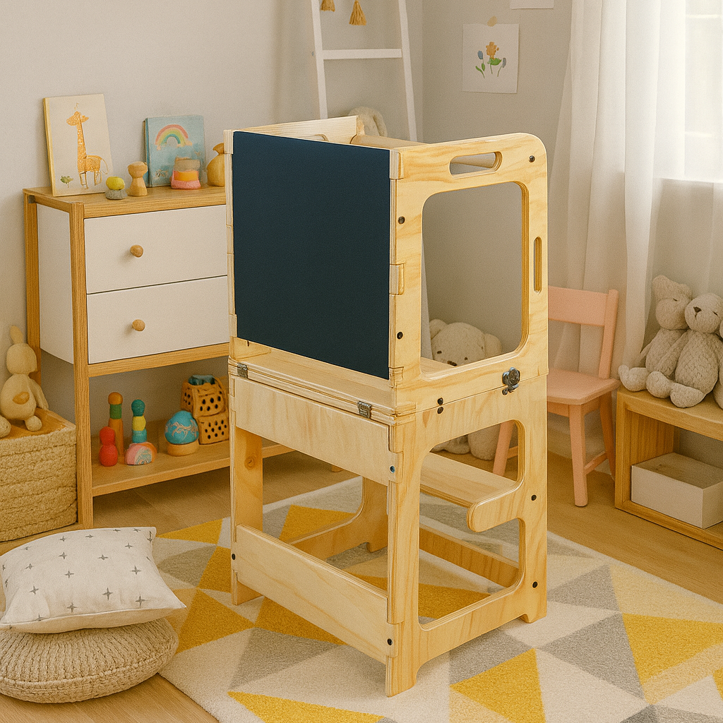 La torre de aprendizaje que crece con tu pequeño explorador. Este versátil mueble se transforma según las necesidades de tu hijo: desde plataforma segura para alcanzar la cocina, hasta escritorio para crear y jugar.
