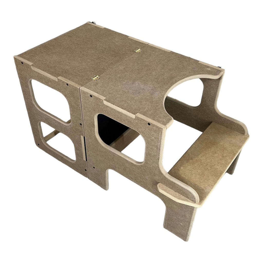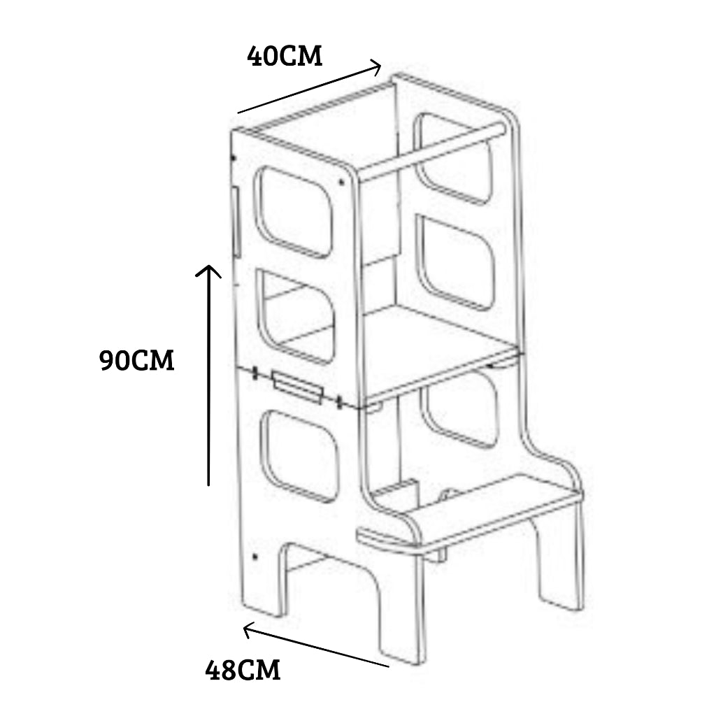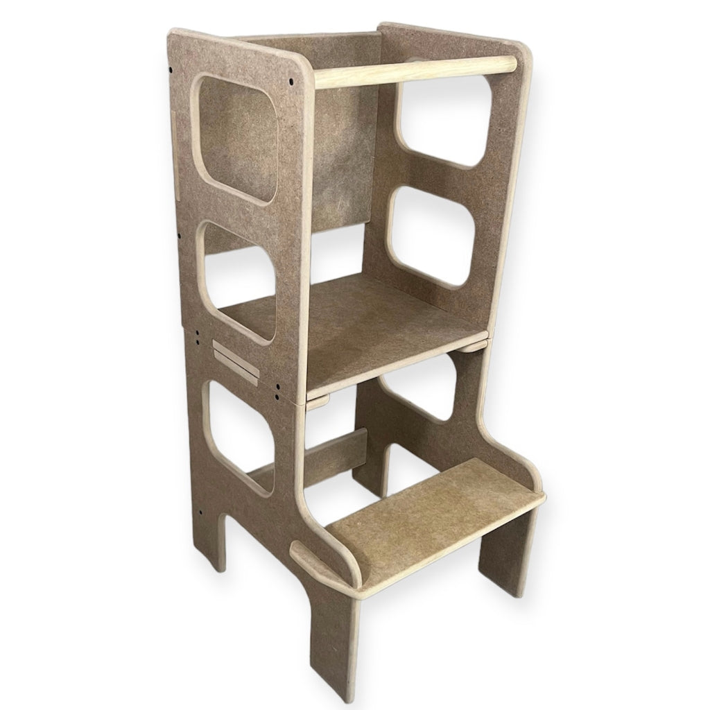 La torre de aprendizaje que crece con tu pequeño explorador. Este versátil mueble se transforma según las necesidades de tu hijo: desde plataforma segura para alcanzar la cocina, hasta escritorio para crear y jugar.